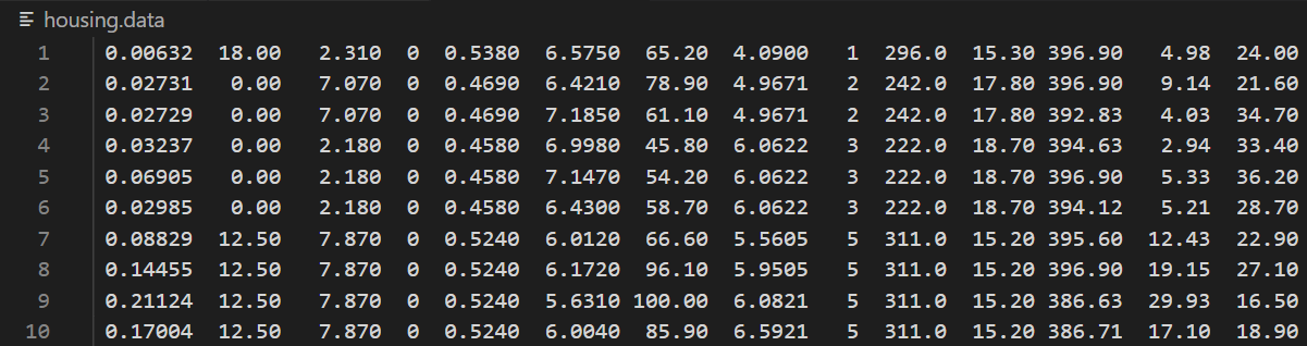 data_url = 'https://archive.ics.uci.edu/ml/machine-learning-databases/housing/housing.data' # Data URL