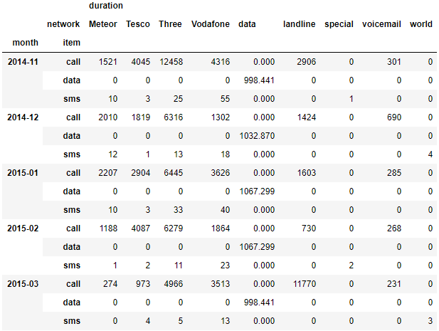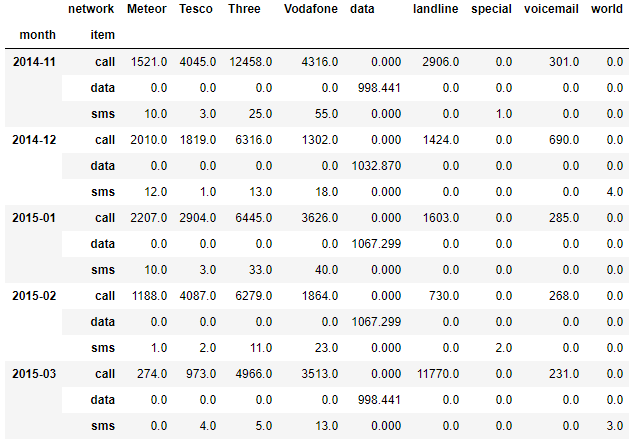 In [5]:pd.crosstab(index=[df_phone.month, df_phone.item],