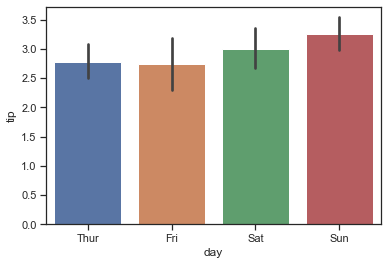 - x를 day(요일)로 지정하니 주말에 팁이 평균적으로 더 많다는 것을 확인할 수 있다.