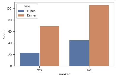In [11]:sns.countplot(x='smoker', hue='time', data=tips)