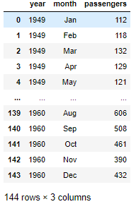 - 이 Dataset은 1949년부터 1960년까지의 월별 비행기 승객 수 데이터이다.