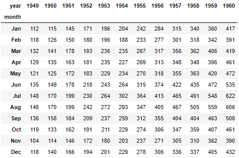 - 그래서 Pivot함수를 사용해서 연도별/월별 승객수의 피벗 테이블을 생성한다.