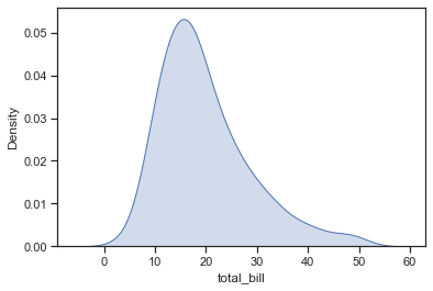 - y축을 Density라고 표현했는데, total_bill의 분포도를 '밀도'라는 기준으로 표현한 것인데, histogram과 유사한 개념이라고 이해하면 쉽다.
