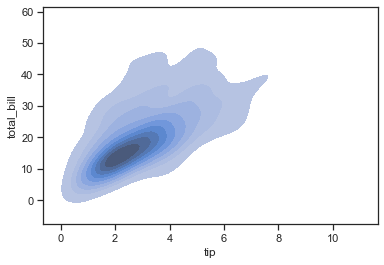 In [18]:sns.kdeplot(tips['total_bill'], tips['tip'], shade=True, vertical=True)