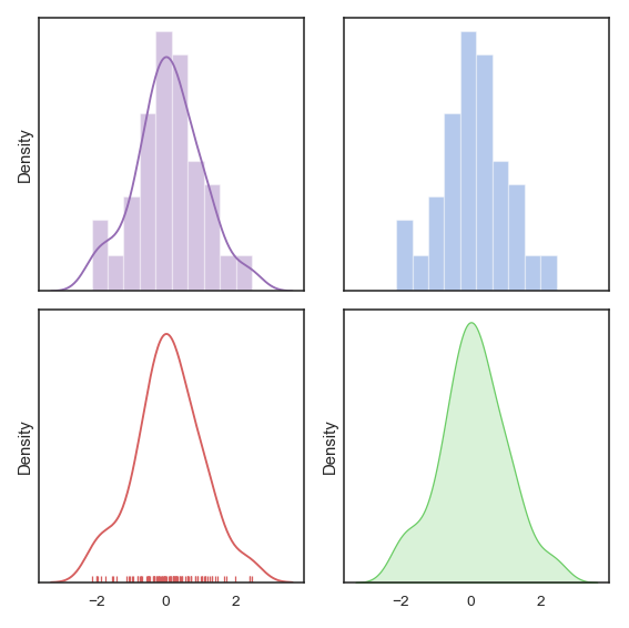 - 기본적으로 d/color/ax만 지정해주면 좌상단의 그래프처럼 histogram과 KDE (밀도) plot이 동시에 그려진다