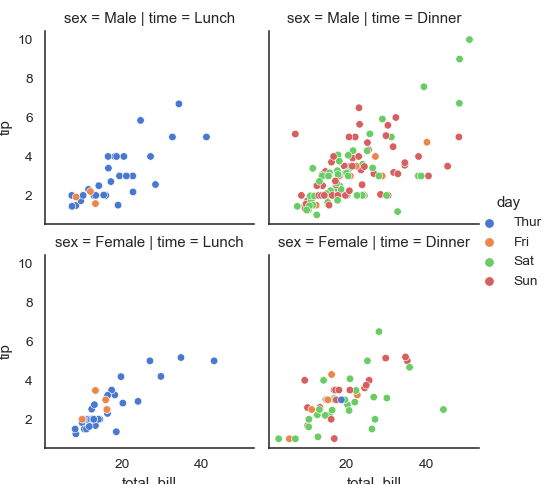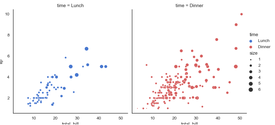 - 그래서 위 데이터에서 보다시피 Lunch의 TotalBill vs Tip의 데이터와 Dinner의 데이터를 따로 구분해서 볼 수 있게 된다.