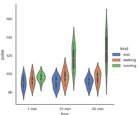 - kind='violin' 을 지정하면 동일한 데이터를 바이올린 형태로 그릴 수 있다.