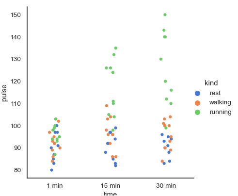 - 그래서 x='time'으로 구분하였고, 위 그래프는 1분/15분/30분 운동을 했을 때의 심박수를 그래프로 그렸고,