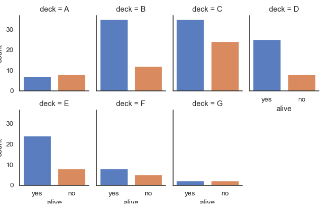 - alive에 대한 count plot을 각 deck별로 그리고, 한 row에 4개씩만 표현되도록 catplot을 그리라는 명령어이다.