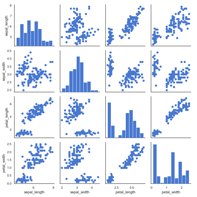 - g.map_diag(plt.hist) : diagonal 위치에는 histogram을 그려라