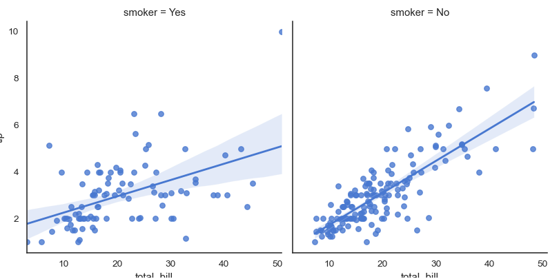 In [39]:sns.lmplot(x='total_bill', y='tip', col='smoker', data=tips)