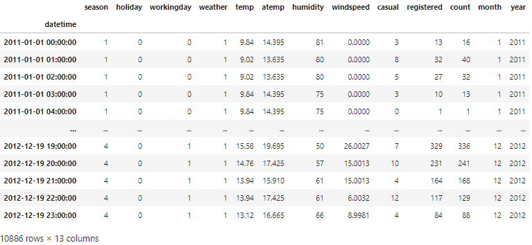 - www.kaggle.com/c/bike-sharing-demand/data?select=train.csv에서 데이터를 다운받아서 csv를 읽어오면 다음과 같이 데이터가 열린다.