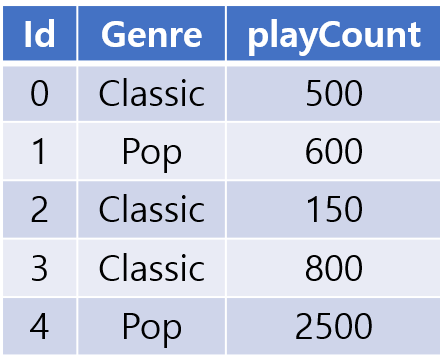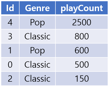 - 예를 들어 Pop의 경우에는 4번과 1번이 가장 인기 있는 곡이고, Classic은 3번과 0번이 순서대로 가장 인기 있는 곡이 될 것이다.