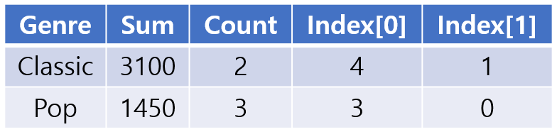 - 따라서 pop 장르의 [4, 1]번 노래를 먼저, classic 장르의 [3, 0]번 노래를 그다음에 수록합니다.