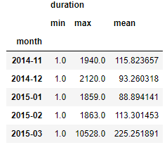 In [19]:grouped = df_phone.groupby('month').agg({'duration':[min,max, np.mean]})