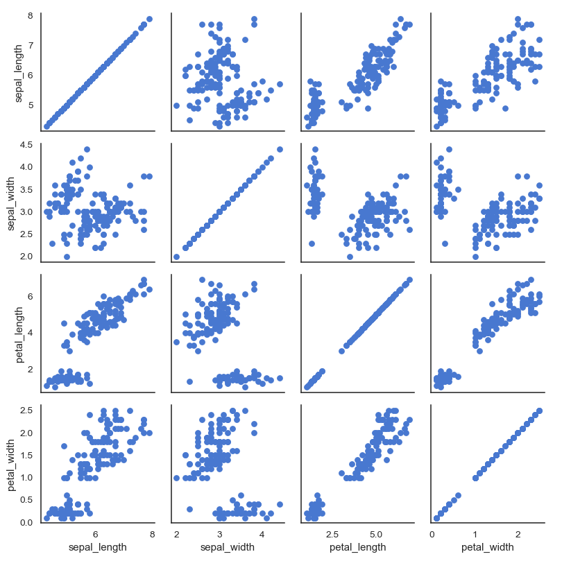 - g.map_offdiag(plt.scatter) : diagonal 외에는 변수들 간의 scatter plot을 그려라